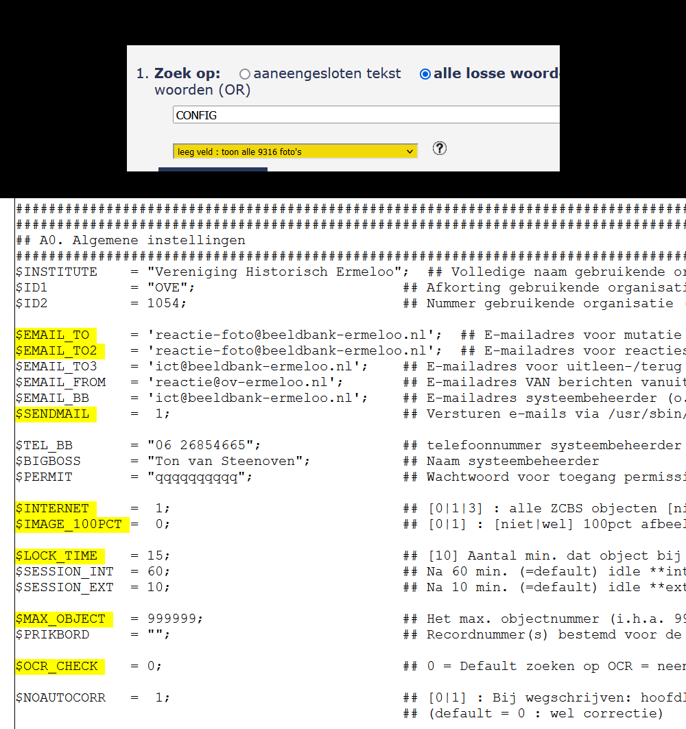 Door in de betreffende beeldbank het systeem zoekwoord CONFIG toe te passen worden alle variabelen in een lijst getoond. Daarbij zijn de al in gebruik genomen variabelen van een gele markering voorzien (staan al genoemd in de actule cfg-cbs.pl).